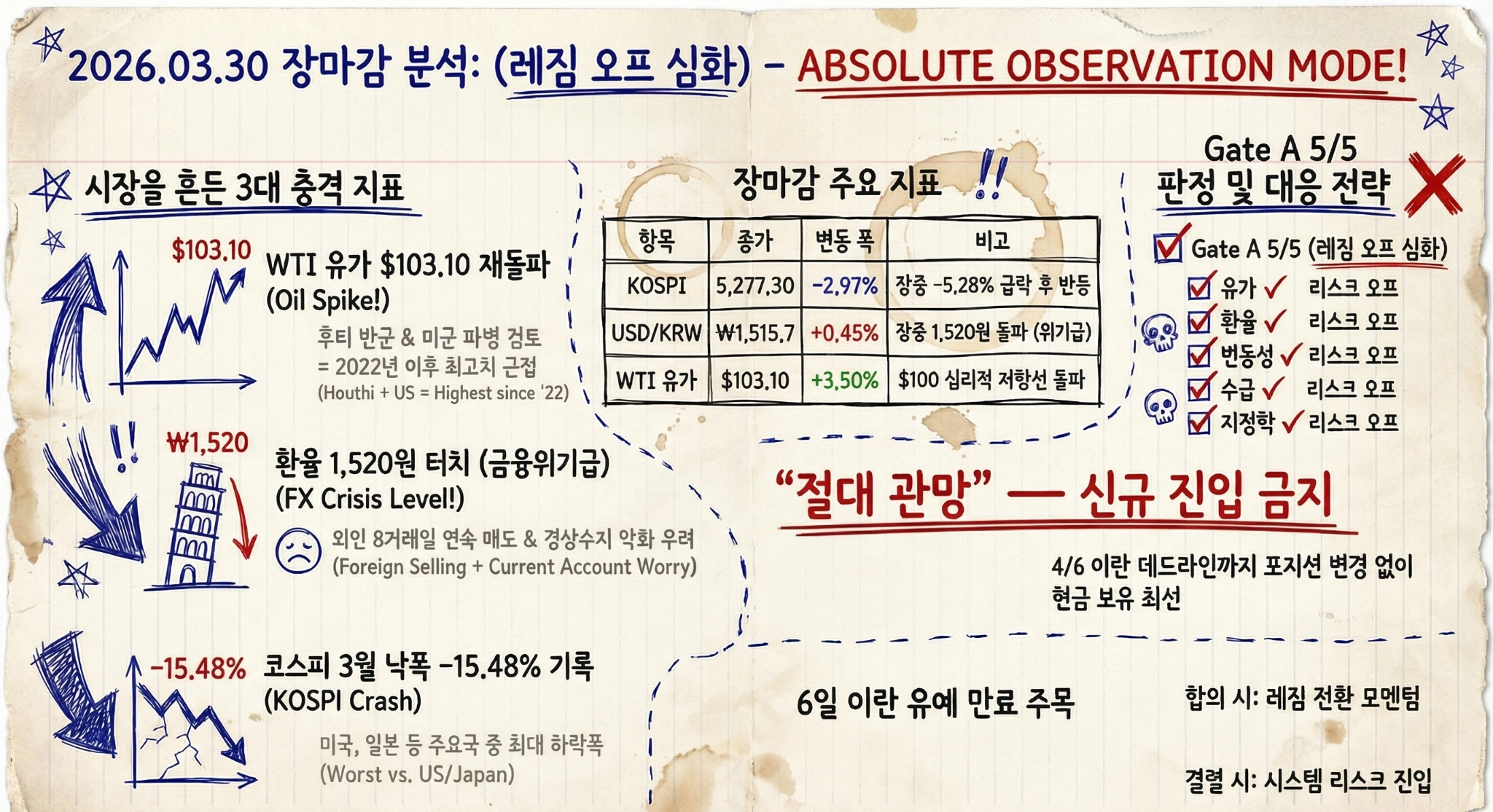레짐 | WTI $85 이하 2일 연속 • 환율 ₩1,480 이하 OR 이란 휴전 공식 합의 | 유지 (현재 괴리 확대: WTI $103 vs $85 기준) |