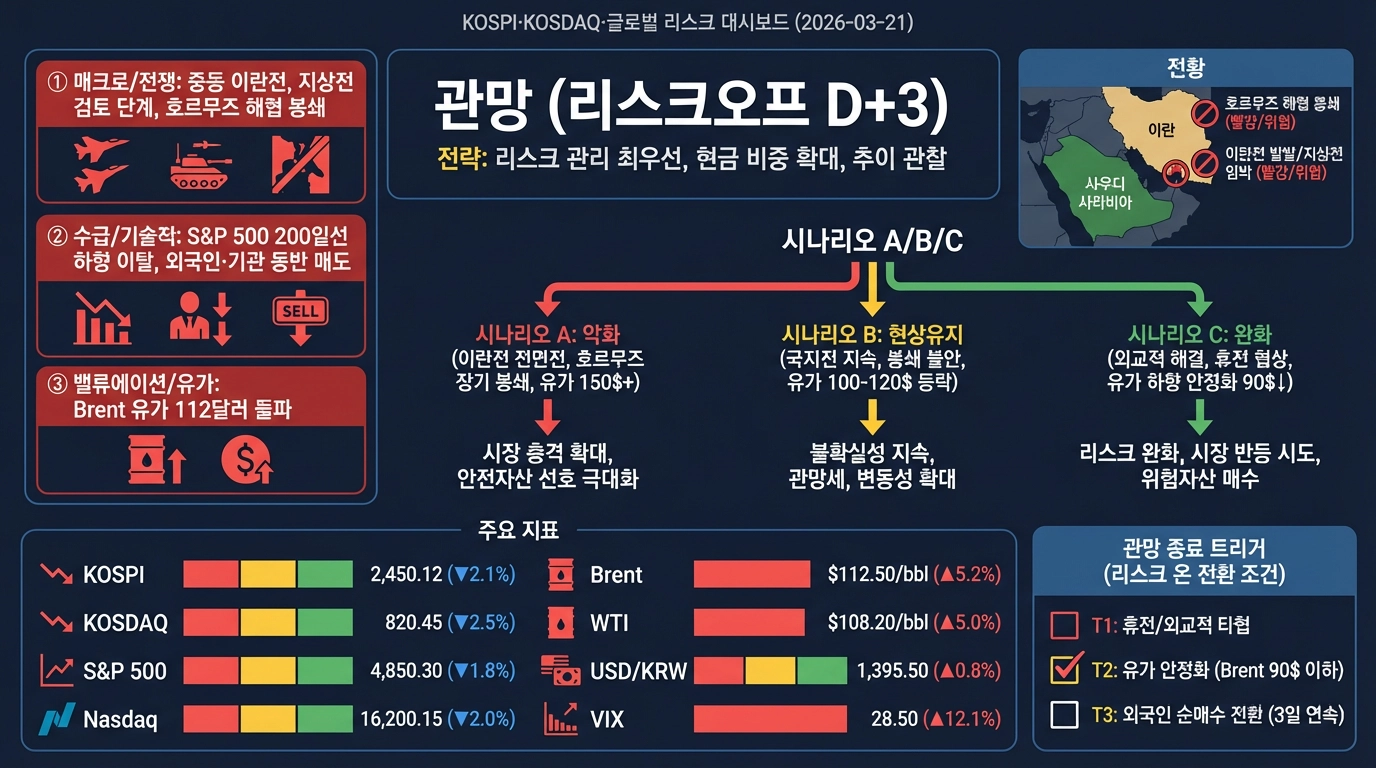 이란전 조기종결 기대: 3/20 KOSPI +0.31%로 소폭 반영 → 미증시 -0.81% + Brent $112 급등 + 지상전 검토 보도 = 기대감 과잉, 되돌림 압력 높음