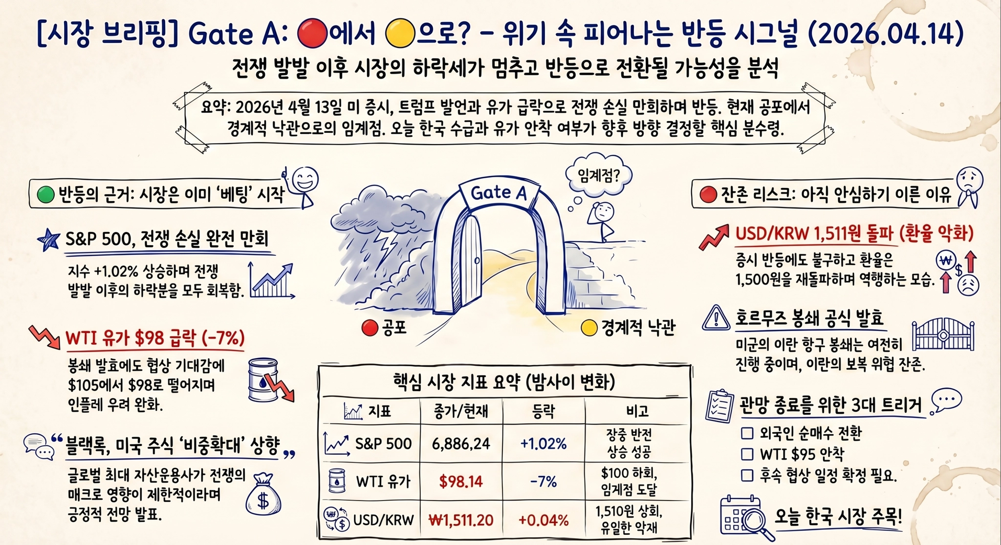 "이 리스크에도 불구하고": ① S&P 전쟁 손실 만회 = 글로벌 센티멘트 전환 신호 ② WTI $98 = 유가 정상화 경로 진입 ③ 1Q 어닝 IT +44% = 실적이 지정학을 압도하기 시작.