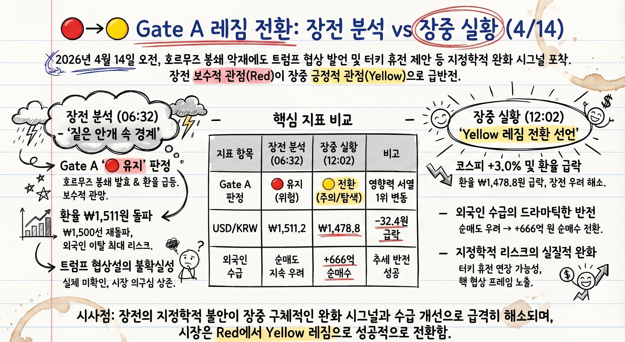 ① 환율 야간 호가(₩1,511)와 장 시가(₩1,478.8)의 괴리가 컸음. 장전 환율은 방향 참고만 하고, 수치는 장 개시 후 확인으로 원칙화해야 함.