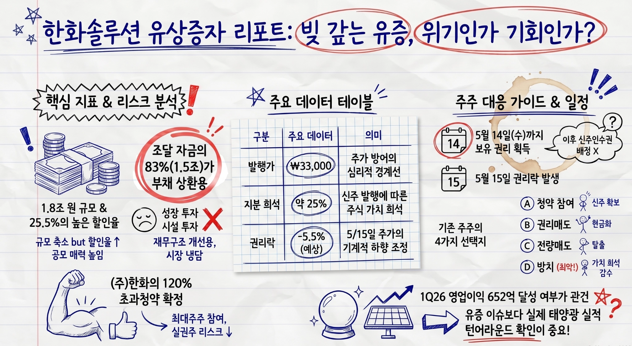 규모 축소(2.4조 → 1.8조, -25%) + 할인율 25.5% + (주)한화 120% 초과청약 = “공포 해소”. 그러나 ① 25% 지분 희석 진행 ② 권리락 -5∼6% 기계적 조정 ③ 조달자금의 83%가 부채 상환용이라는 점이 구조적 강력 긍정 시그널을 막는다.
