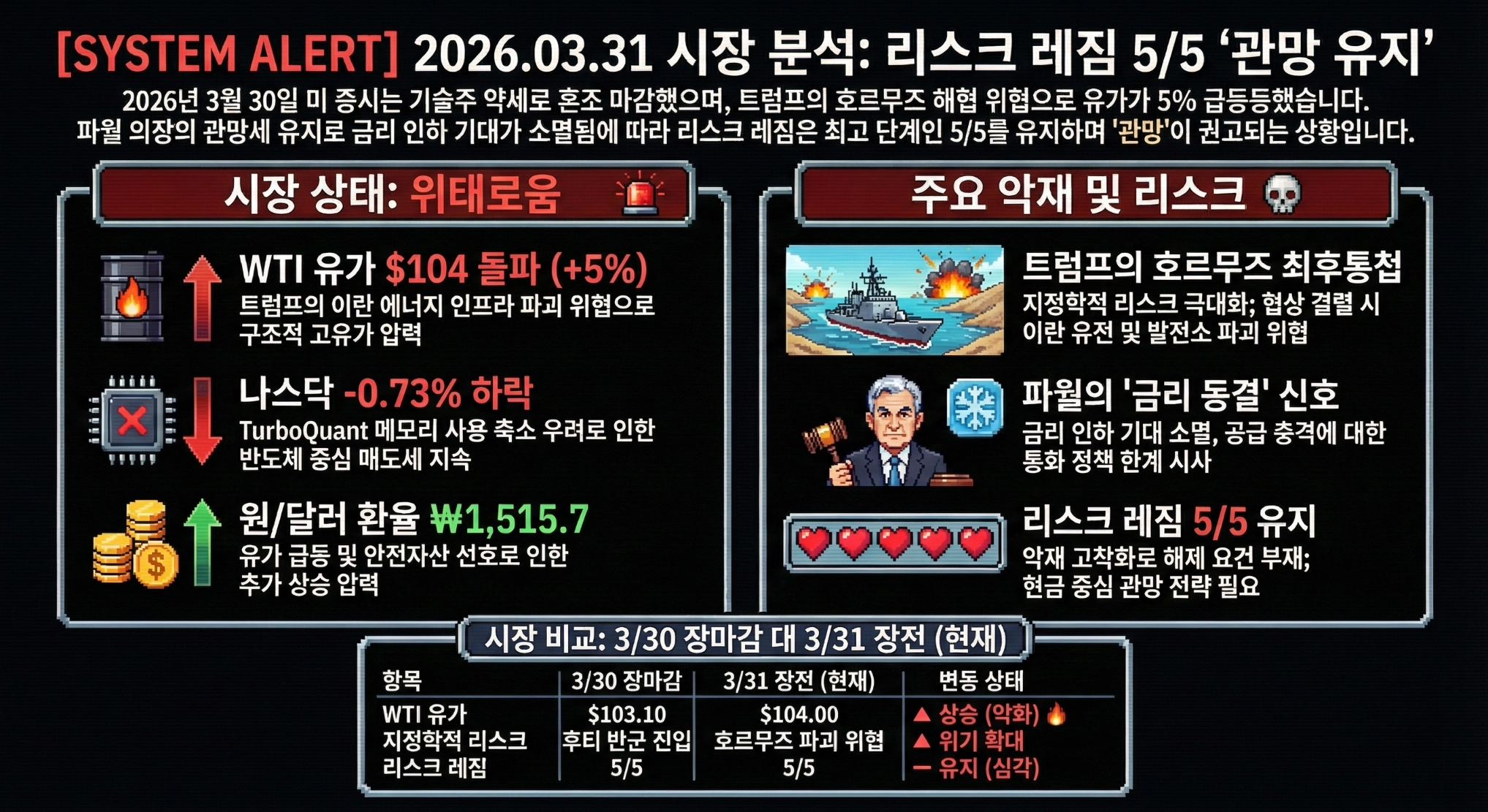 리스크 레짐 5/5 유지. 미증시 선방은 유가 추가 급등($104)에 의해 상쇄. 파월 관망 선언으로 "연준 구원" 기대 소멸. 4/6 데드라인까지 5일 — 포지션 변경 자제, 현금 보유 = 최적 전략 유지.