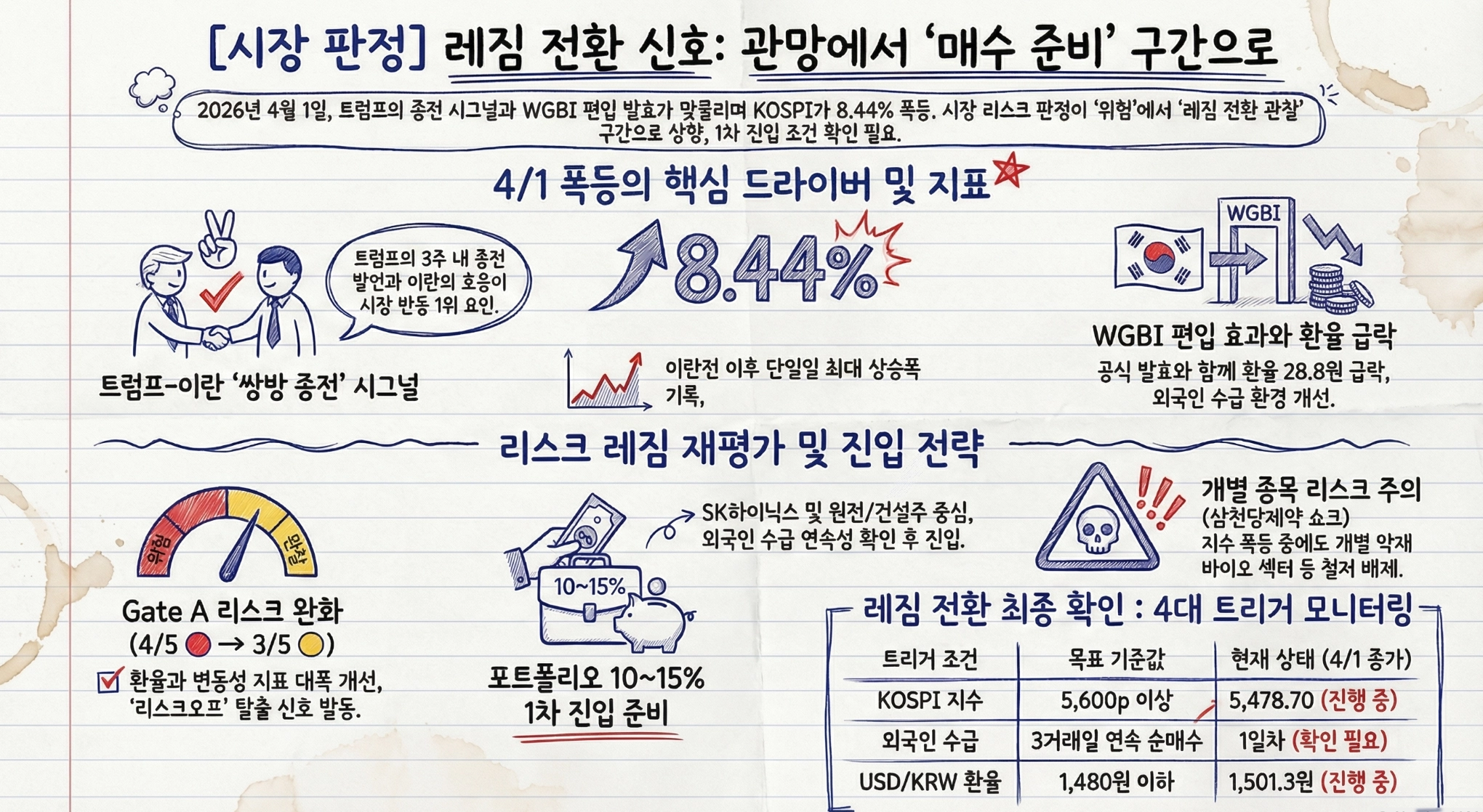 USD/KRW | ₩1,501.3 | -28.8원 급락 | WGBI 편입 첫날 + 종전 기대 쌍끌이 |
