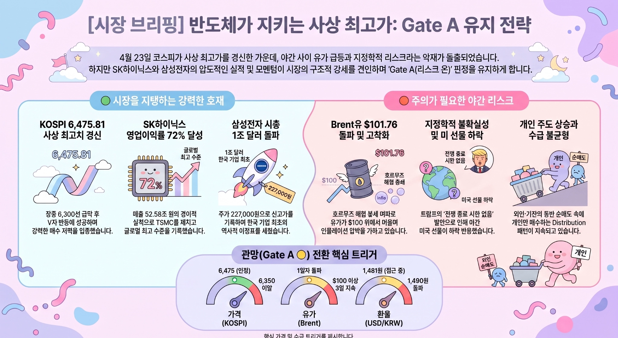 4월 23일 한국 증시가 마감된 뒤, 야간 시간대에는 호재와 악재가 뚜렷하게 엇갈리는 신호가 쏟아졌다. 낮 시간대에는 반도체 실적 서프라이즈와 KOSPI 사상 최고치 경신이라는 압도적 호재가 시장을 이끌었지만, 야간에는 유가 $100 돌파 고착화, 트럼프의 전쟁 장기화 발언, 미국 선물 하락이라는 악재가 균형추를 기울이고 있다.