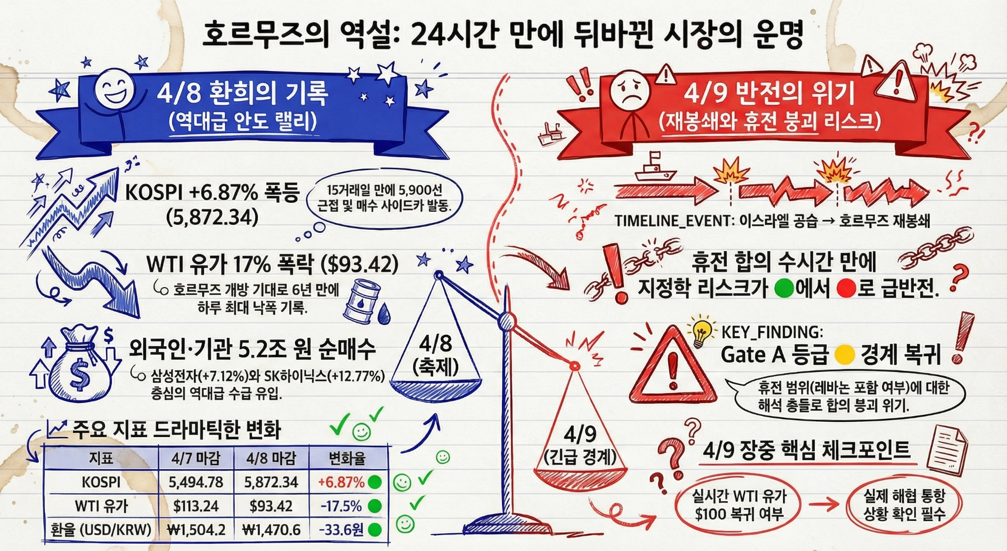 로 전환된 역사적 전환일이었다. 그러나 장 마감 후 이스라엘 레바논 공습 → 이란 호르무즈 재봉쇄로 상황이 급변. 위 데이터는 재봉쇄 뉴스 반영 전 확정치이며, 4/9 장중 유가·환율·선물에서 재봉쇄가 반영될 가능성이 높다.