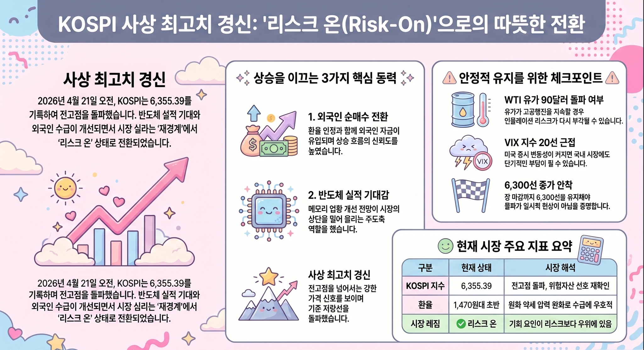 판정: KOSPI가 장중 사상 최고치를 경신한 핵심 동력은 반도체 실적 기대와 외국인 수급 전환이다. 유가와 지정학 리스크는 남아 있지만, 2026-04-21 오전 기준 시장은 이를 단기 변동성 요인으로 낮춰 평가하고 있다. Gate A는