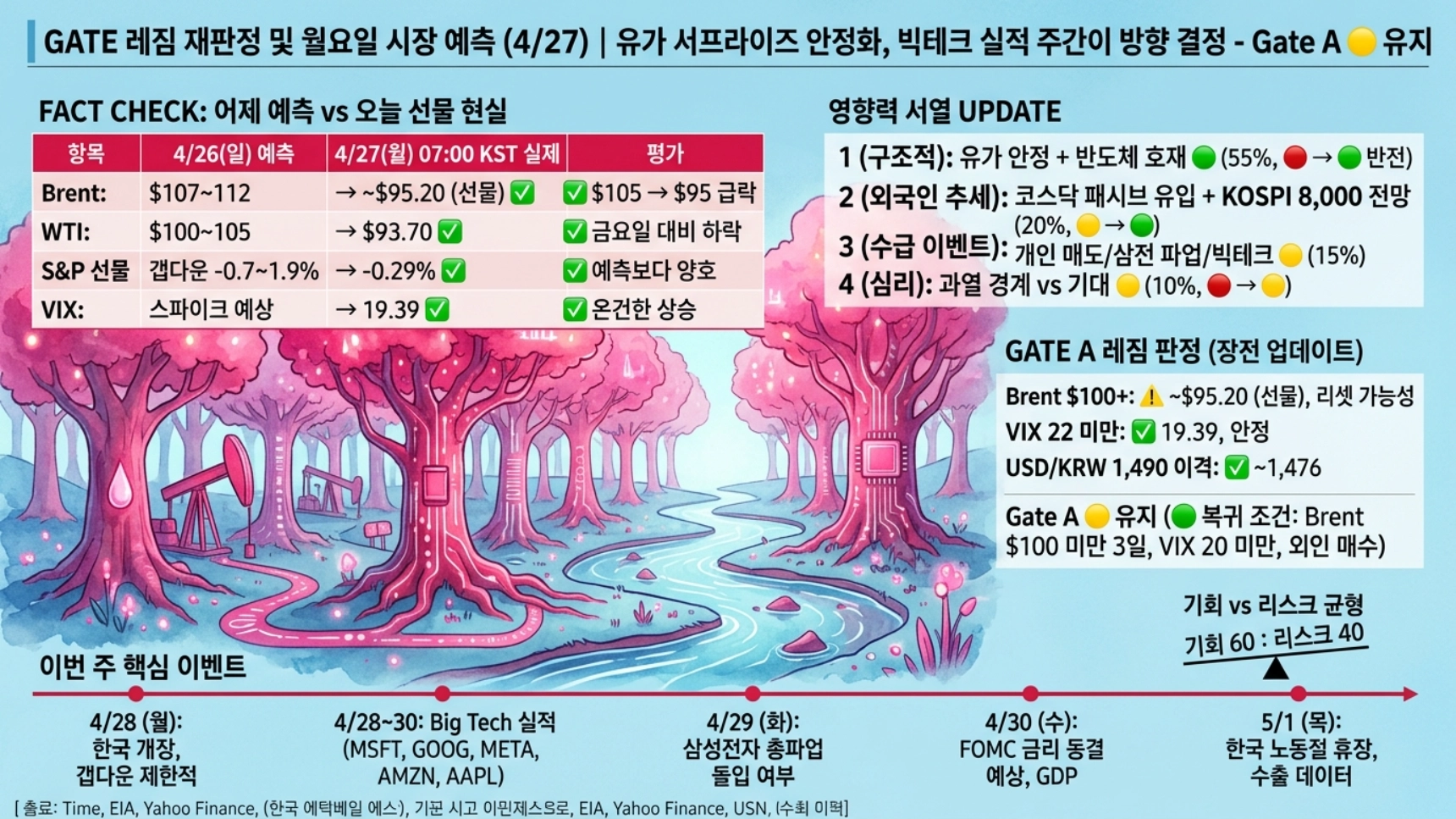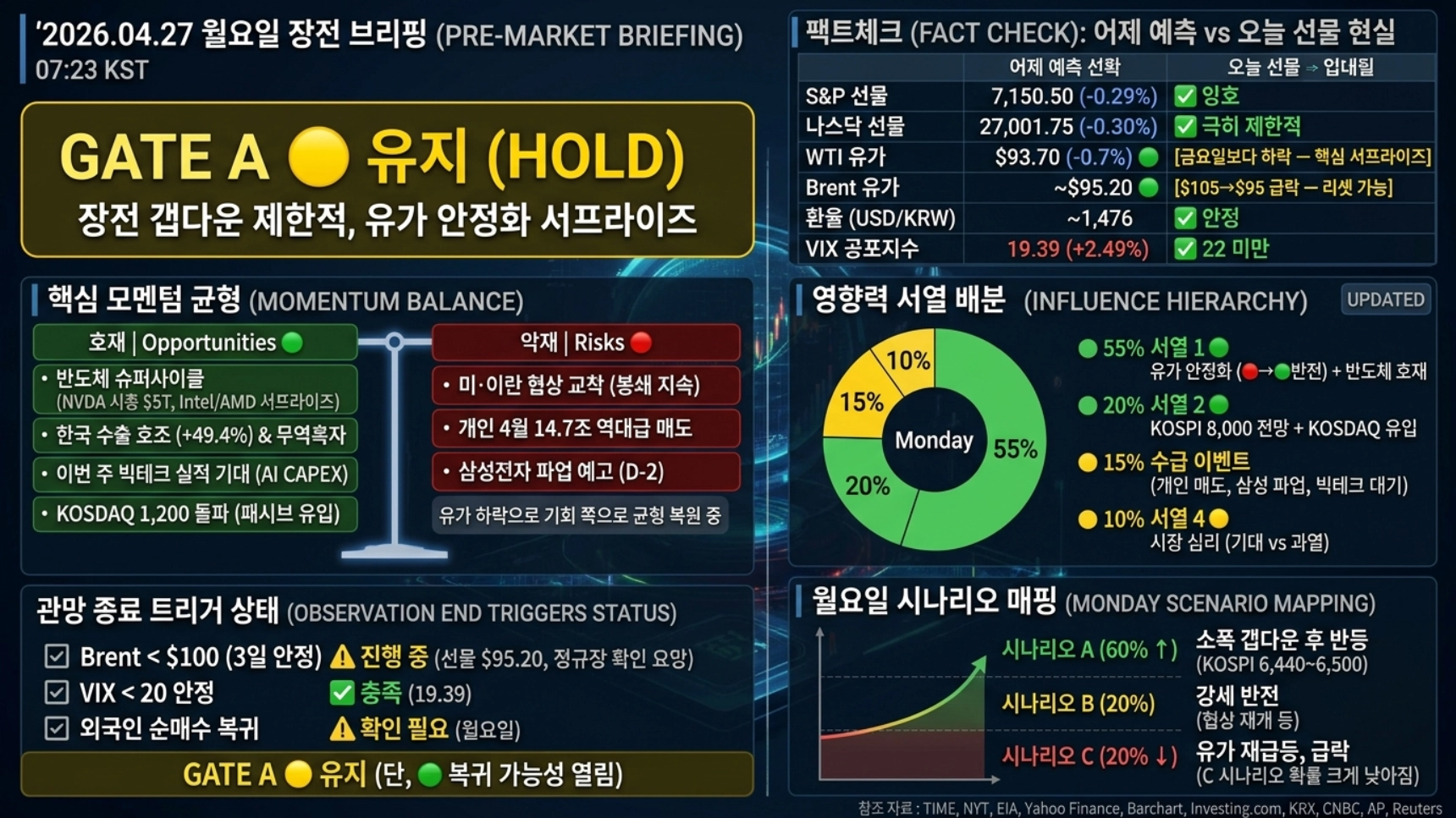 한 줄 판정: 어제(4/26) "협상 취소 → Brent $110 → 갭다운 -1~2%" 시나리오를 제시했으나, 일요일 선물 개장 결과 WTI $93.70(금요일 $94.40 대비 오히려 하락), S&P 선물 -0.29%로 시장은 예상보다 냉정하게 반응. Brent $100+ 지속 트리거가 리셋 가능성을 보이나, 협상 재개 불확실성으로 Gate A